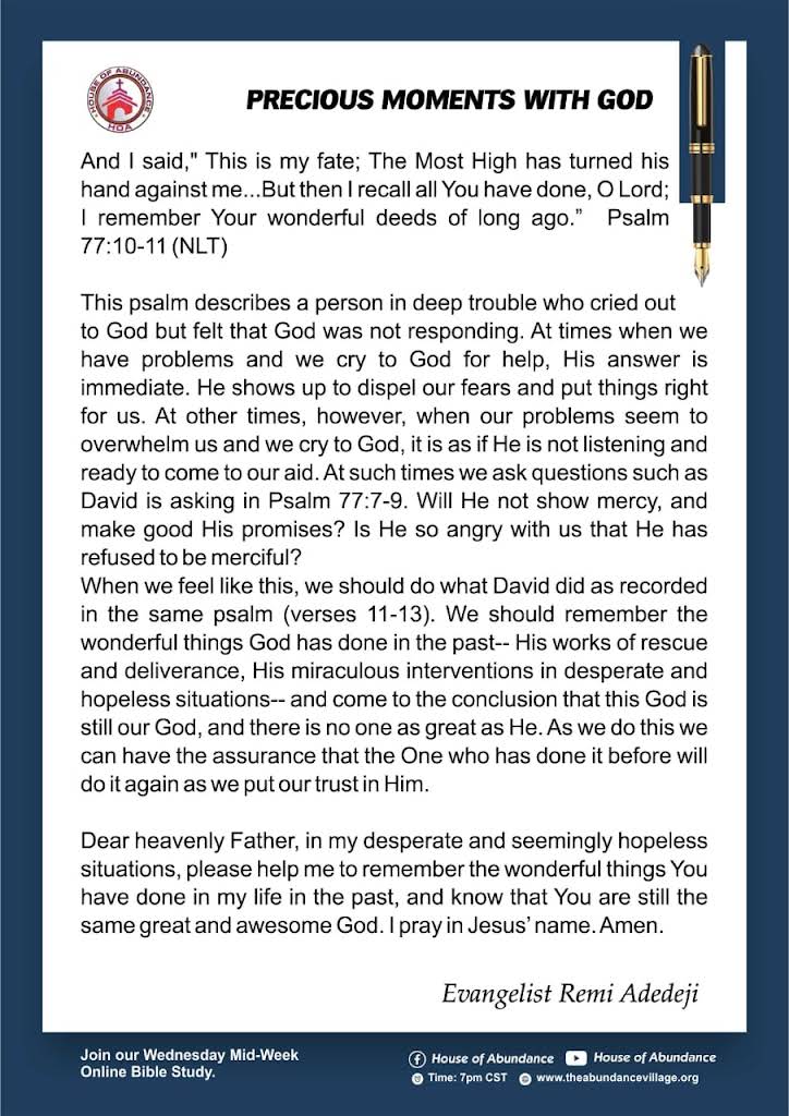 I remember your wonderful deeds of long ago. New Living Translation 11 But then I recall all you have done O Lord. All night long I prayed with hands lifted.